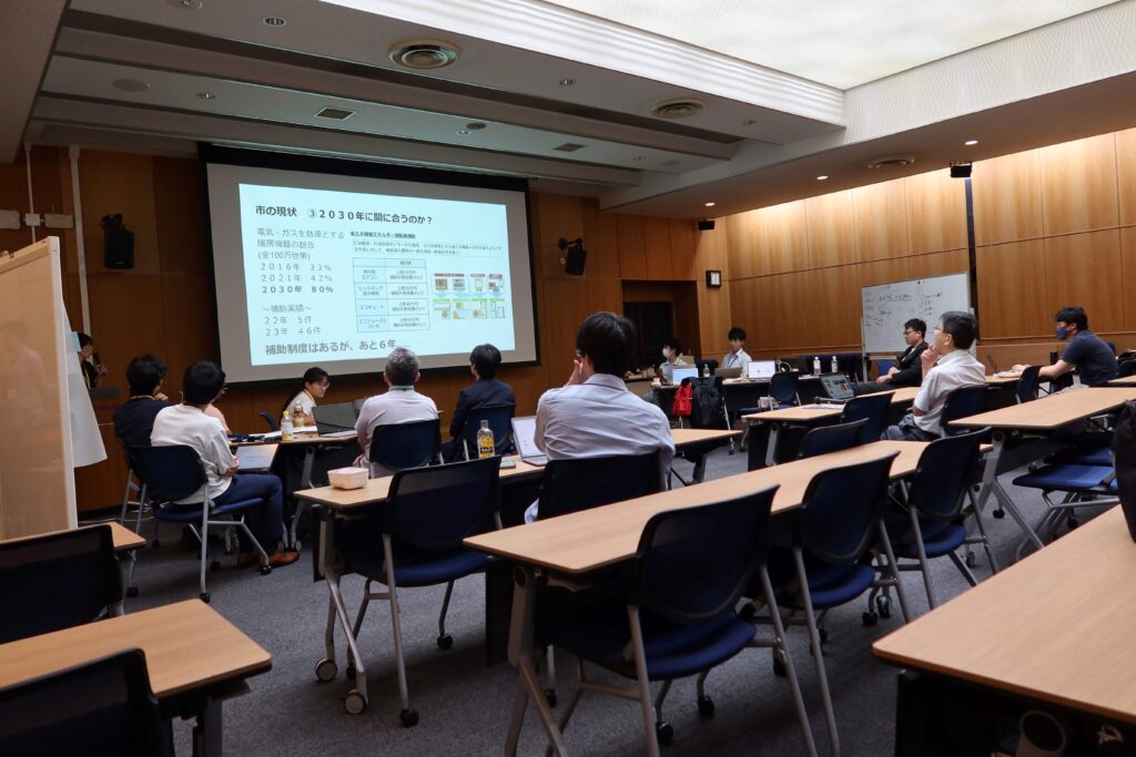 最終日9月4日のCO-CREATIONA WORK SHOPでは、サステイナビリティ推進機構及び施設部の職員は、大学のキャンパス内での一次エネルギー消費量や二酸化炭素排出量の推移を説明し、2050年のカーボンニュートラルに向けて電化率向上なども含めたさらなる対策が必要であることを説明しました。その後、学生たちは「2050のエネルギーシナリオ検討」「熱源転換へのアクションプラン」の2グループに分かれて新しいアプローチやアクションの検討を行いました。各グループには、札幌市環境局職員らと共に、サステイナビリティ推進機構及び施設部の職員も各グループに加わり、学生らがアイデア抽出にあたっての、情報提供やコメント提供を行いました。グループ討論後、学生達は各グループで検討したアクションの発表を行いました。