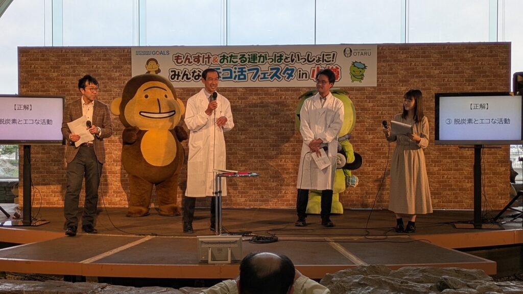 クイズでは、地球温暖化の進行により日本で増加する可能性のある現象、食品ロスを減らすための有効な行動、公共交通の利用がデコ活につながる理由など、小樽市の生活にも関わる問題が出題されました。解説では、二酸化炭素の排出を削減して地球温暖化の影響を緩和することに加え、温暖化した社会に適応していくことの重要性について啓発を行いました。また、旅客や貨物の移動によって発生する二酸化炭素の量や、小樽市における生活系廃棄物の発生量などについても説明しました。