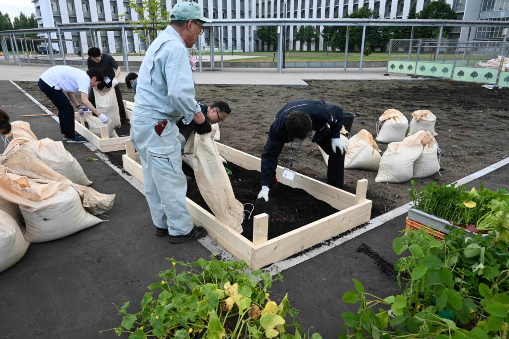 本プロジェクトでは、札幌キャンパスで回収された落葉から生成された腐葉土を活用し、総合博物館の中庭にSDGs農園を造成しました。SDGs農園の維持管理は、本学の教職員、北海道マラソン組織委員会、そして学生主体のボランティアグループ「きたみてガーデン」が協力して行っており、キャンパス内での持続可能な資源循環の実践例として注目されています。令和7年度には、北海道マラソン2025のコース沿いに位置する北キャンパスにも新たにSDGs農園を開設し、活動の範囲を拡充しました。これにより、本学教職員のみならず、ランナーや観客がSDGs農園の存在に触れる機会が増え、持続可能性への関心を高める契機となりました。