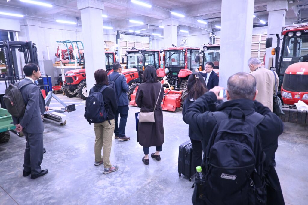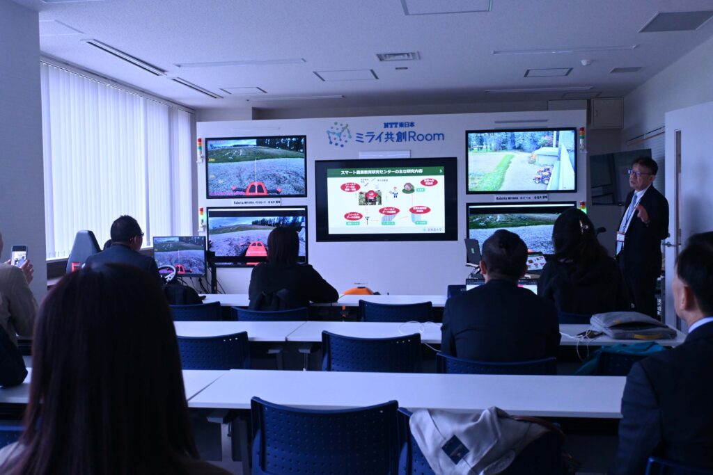 その後、第一農場内にある「スマート農業教育研究センター」に移動し、農学研究院長の野口伸教授によるスマート農業に関する講演が行われました。講演では、担い手の減少と高齢化が進む中、持続可能な農業生産の実現に向けてスマート農業の導入が求められていること、また、農業経営にデータを活用できる人材育成の重要性について説明がありました。さらに、遠隔操作によるトラクターの自動操縦のデモンストレーションが実施され、技術の仕組みや安全性についての実演が行われました。