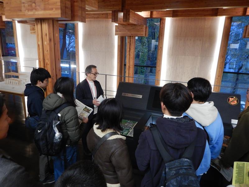 初日は、小雪が舞う生憎の天候の中、キャンパスツアーを実施しました。参加者は、北キャンパス総合研究棟8号館(ICReDD棟)、北キャンパス屋外パブリックスペース及び医学部百年記念館を見学することで、持続可能性に配慮したキャンパス整備の現場を体感していただきました。