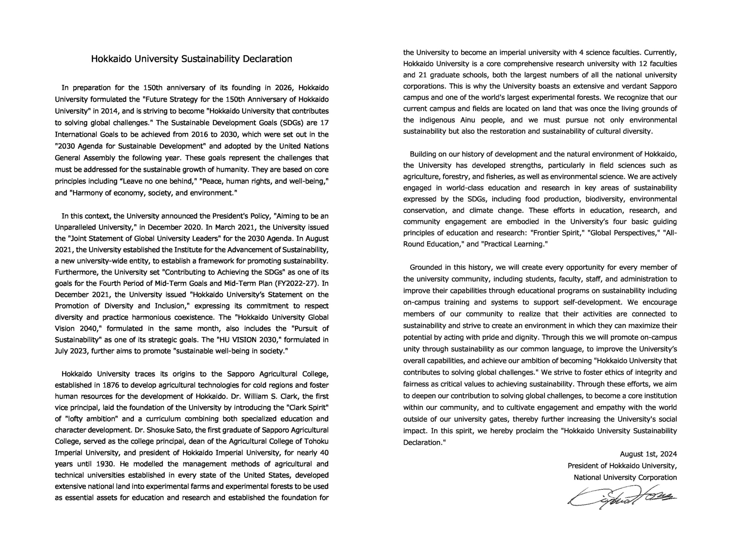On August 1, 2024, Hokkaido University formulated the Hokkaido University Sustainability Declaration.