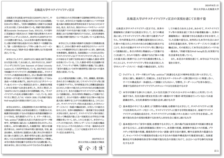 「北海道大学サステイナビリティ宣言」では、『本学の教職員・学生等を含む全ての構成員に対して、SDGsを含むサステイナビリティ(以下「サステイナビリティ等」という。)を共通言語とした学内エンゲージメント(一体感)の醸成を図り、大学としての総合力を向上させ、あわせて、サステイナビリティ等の実現に当たって構成員が重んじるべき倫理観を養い、もって世界の課題解決に一層貢献できる大学を目指すこと』及び『このことを通じて、本学がコミュニティの中核となり、学外エンゲージメント(共感)を醸成することによって、その社会的インパクトを一層高める大学になる』という決意を掲げています。