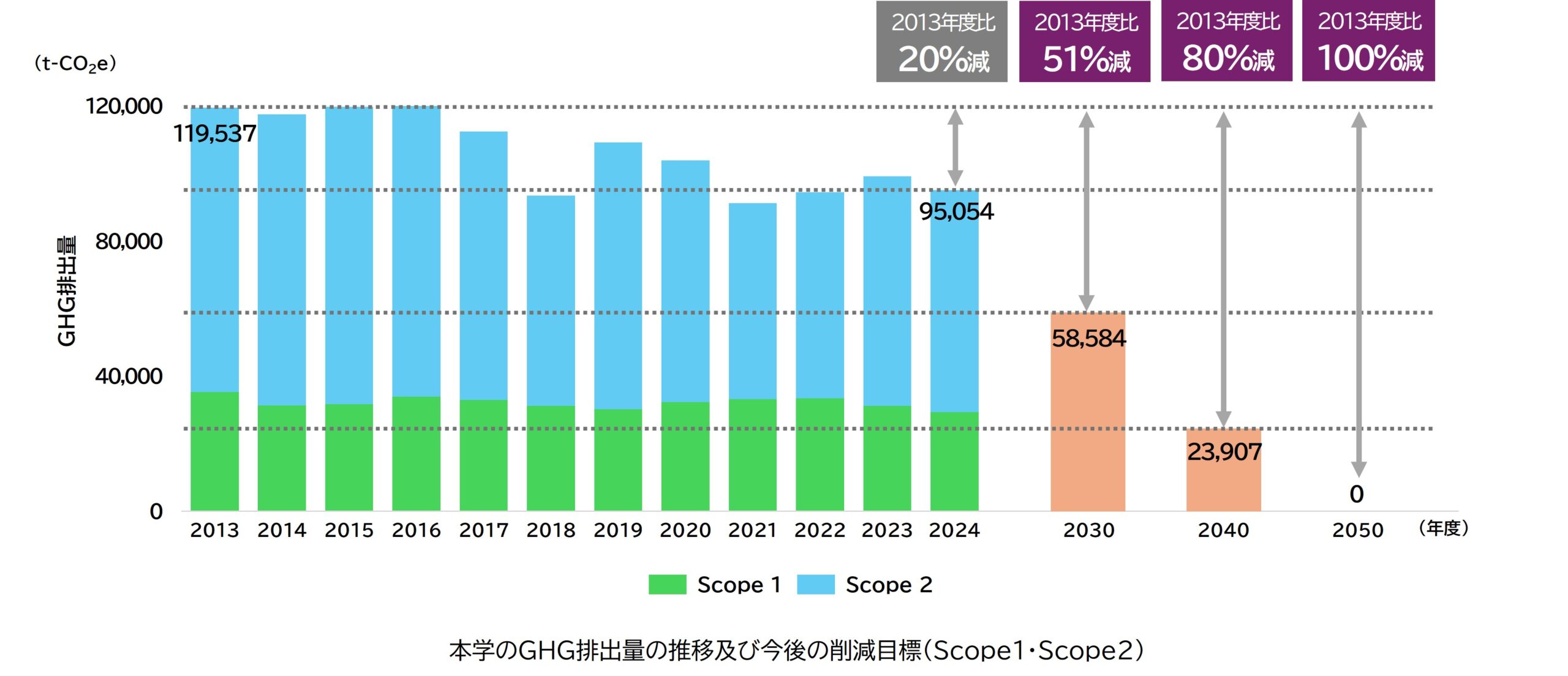 本学のGHG排出削減目標は、Scope1・Scope2において、2030年度までに2013年度比51%削減、2040年度までに80%削減を掲げています。さらに2050年には、Scope1・2・3のすべてを対象としたカーボンニュートラルの実現を目指します。